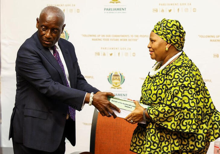 [1/3] South Africa's former Chief Justice Sandile Ngcobo hands over the report to the Speaker of Parliament, Nosiviwe Mapisa-Nqakula on whether or not President Cyril Ramaphosa should face an impeachment inquiry over the Phala Phala saga in Cape Town, South Africa, November 30, 2022. REUTERS/Esa Alexander